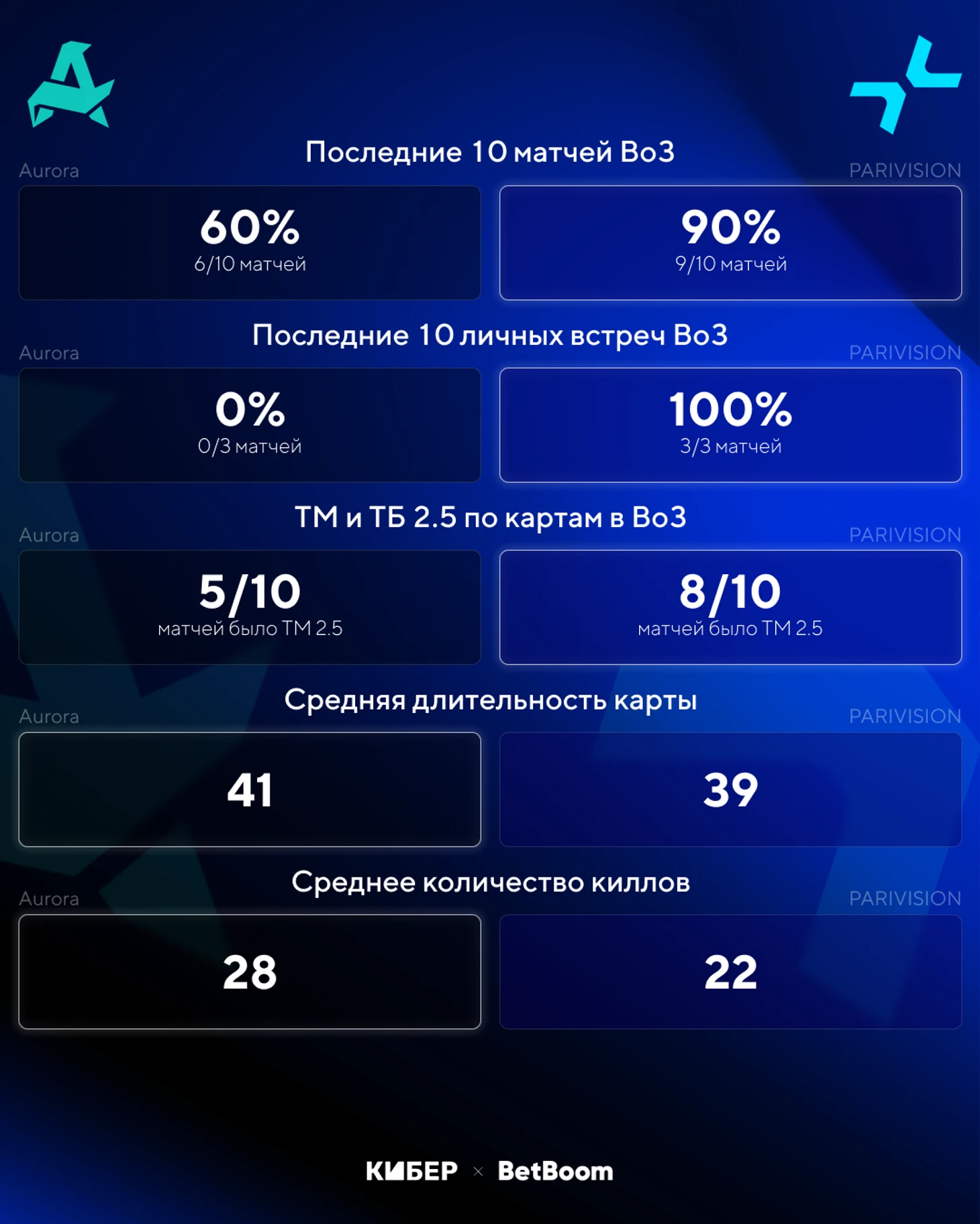 Даже если Aurora не выиграет матч, она доставит много проблем сопернику и заберет карту. PARIVISION тоже должна выиграть как минимум одну мапу, так что предлагаю поставить на тотал карт больше (2,5) с коэффициентом 2,05.