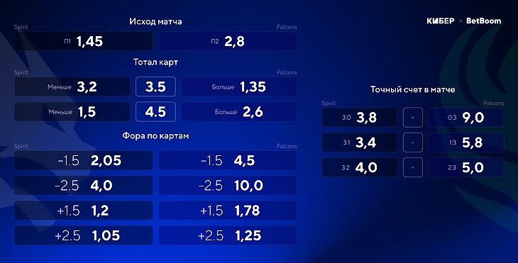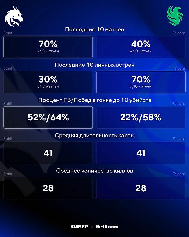 У Falcons совсем не получается проливать первую кровь: только на 3 из 14 карт турнира они сделали FB. У Spirit этот показатель в пределах нормы – 5 из 10 карт принесли FIrst Blood команде. Можно поставить на FB Spirit на первой карте (и на следующих) с коэффициентом 1,8.