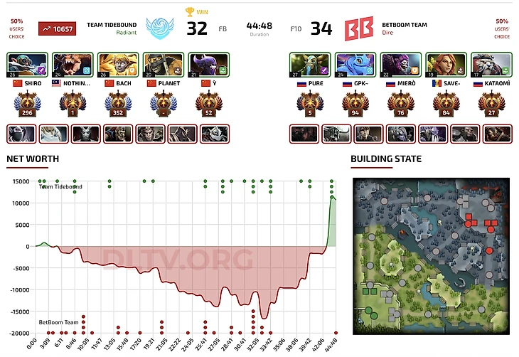 Первый же матч в экспрессе мог обернуться проигрышем – на первой карте Tidebound проигрывала BetBoom Team 16 тысяч золота, но камбэкнула и оставила Владимира в игре.