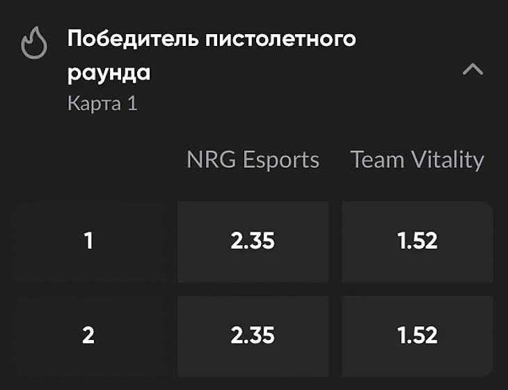 Победитель пистолетного раунда – ставка на то, кто выиграет первый или второй пистолетный раунд. Первая пистолетка – первый раунд на карте. Вторая пистолетка – 13-й раунд на карте и первый после смены сторон.