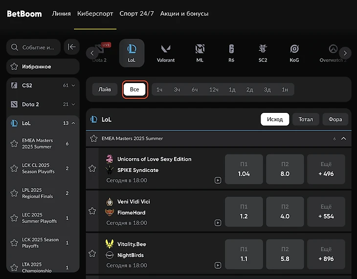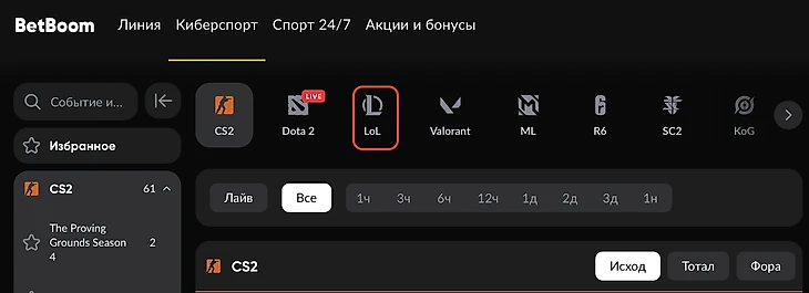 На примере BetBoom покажем, как поставить на Лигу Легенд.