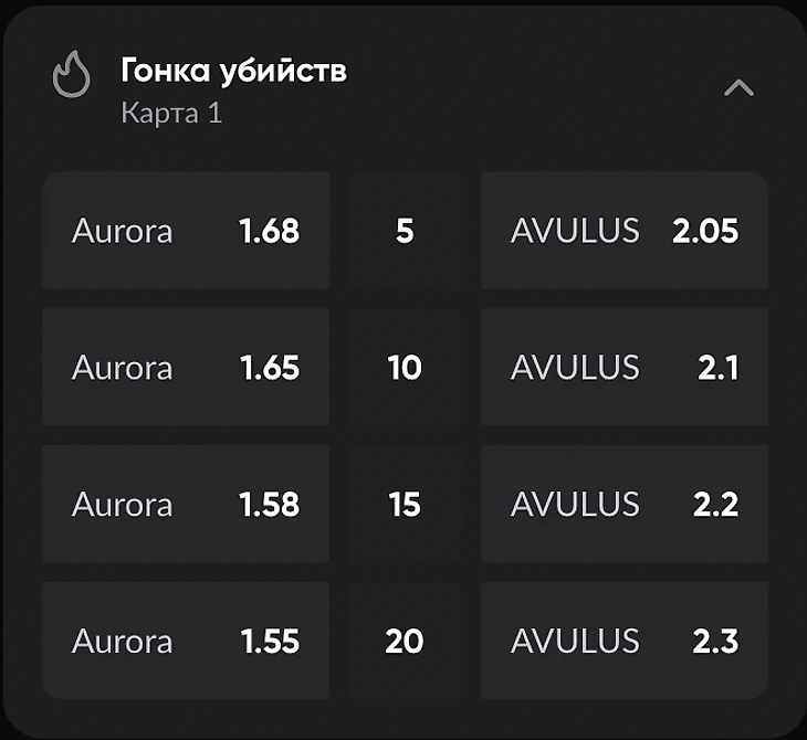 Букмекер предлагает цель – 5, 10, 15 или 20 убийств. Игроку нужно выбрать команду и команду и необходимый порог.