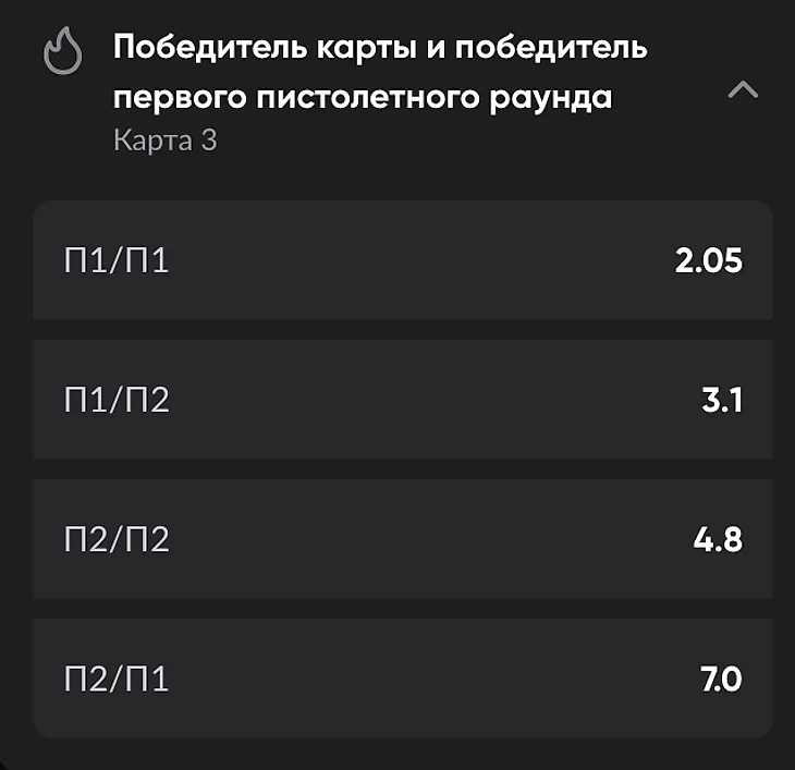 Победитель карты/Победитель первого пистолетного раунда – комбинированная ставка, в которой игрок должен угадать сразу два события: кто выиграет карту, и какая команда победит в первом раунде игры.