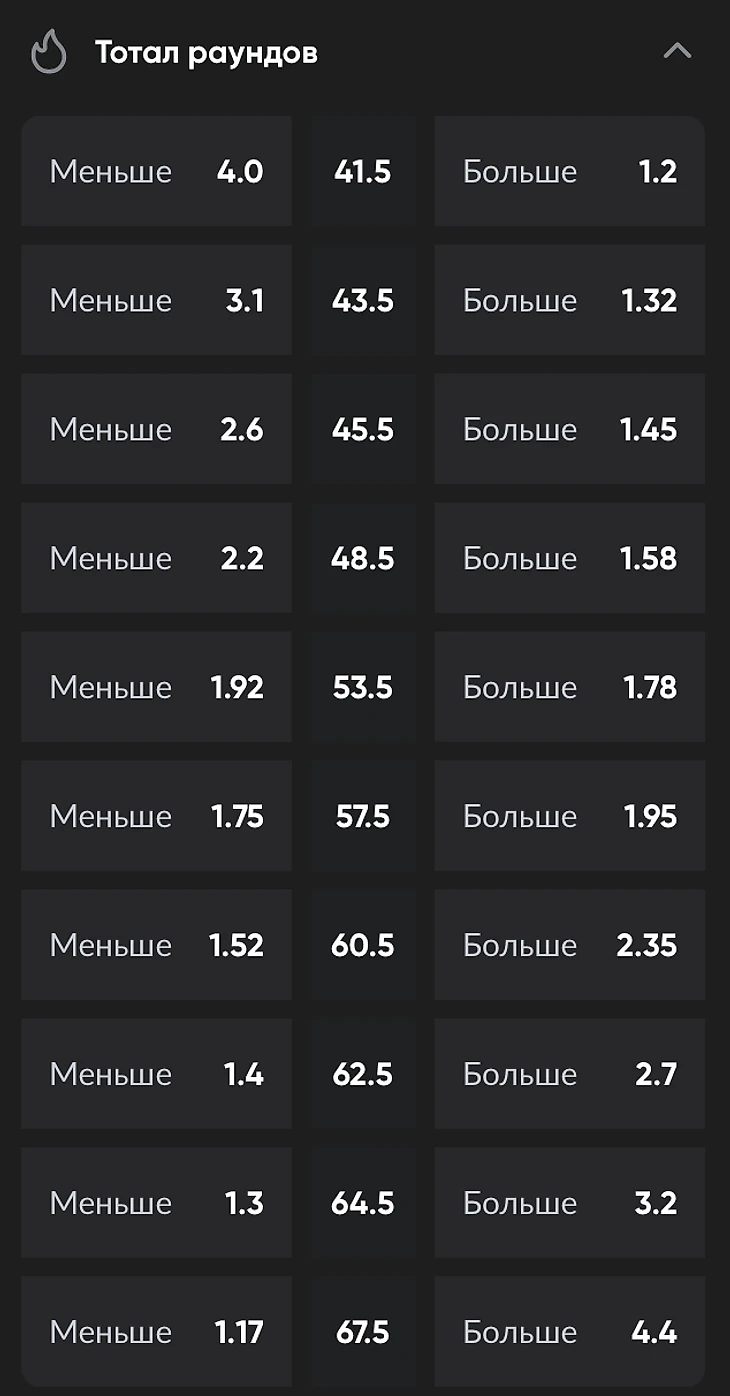 Тотал больше (ТБ) значит, что игрок предполагает большее число раундов, чем установленный показатель. ТБ (39,5) выиграет при 40 и более сыгранных раундах.