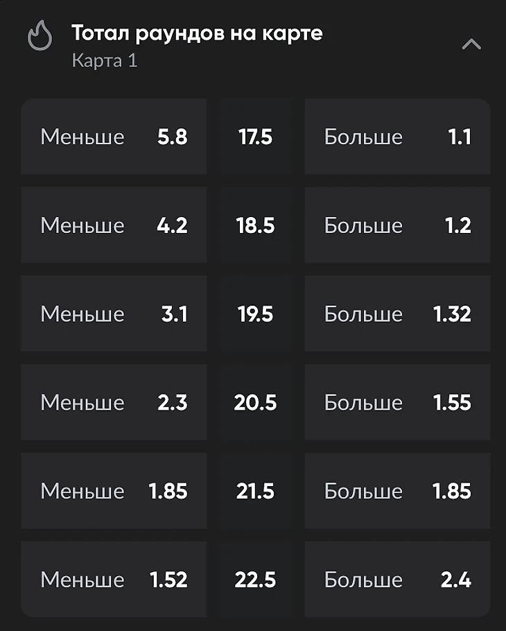 Тотал меньше (ТМ) означает, что вы прогнозируете, что карта завершится раньше заданного порога. Например, ставка ТМ 20,5 выиграет, если сыграно 20 или меньше раундов.