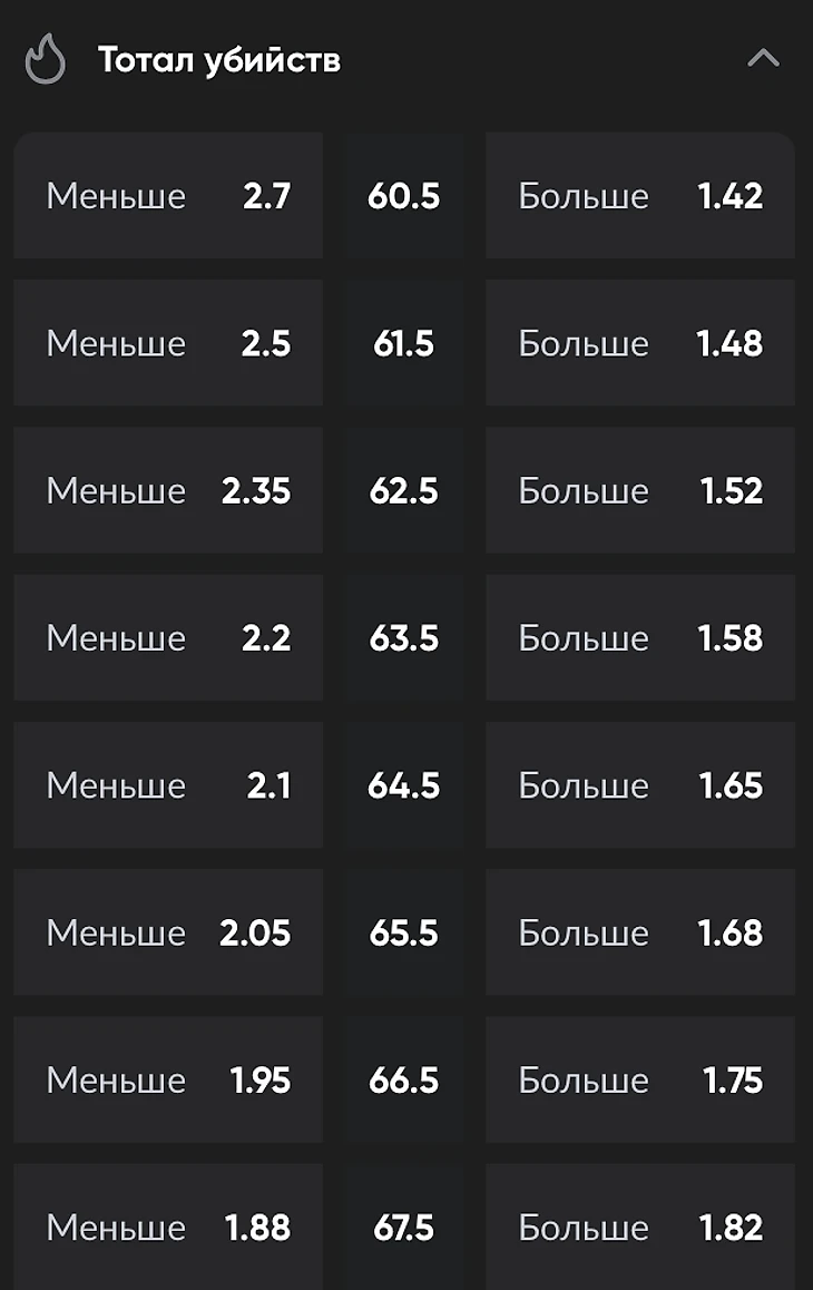 Тотал меньше (ТМ) – игрок прогнозирует, что в матче будет меньше убийств, чем заданное число. Ставка ТМ (26,5) означает, что суммарное количество килов будет 26 или меньше.