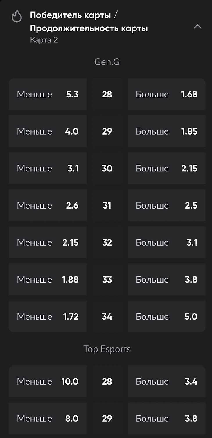 «Победитель карты + продолжительность карты» – это комбинированная ставка, где нужно предсказать две вещи одновременно: какая команда выиграет карту, и будет ли длительность карты больше или меньше заданного тотала минут. Для выигрыша важно, чтобы оба прогноза совпали. Если одно из условий не выполняется, то ставка считается проигранной.