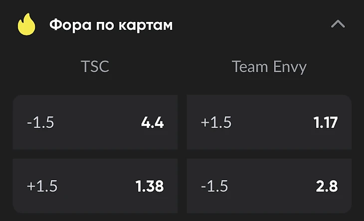 Например, в матче Fnatic и Paper Rex игрок поставил на фору первой команды (+1,5). Его ставка выиграет, если Fnatic проиграет 1:2 или выиграет с любым счетом, потому что в этих случаях у Fnatic будет больше итоговых очков. Если Fnatic проиграет 0:2, то ставка игрока окажется неудачной, ведь 0 +1,5 < 2.