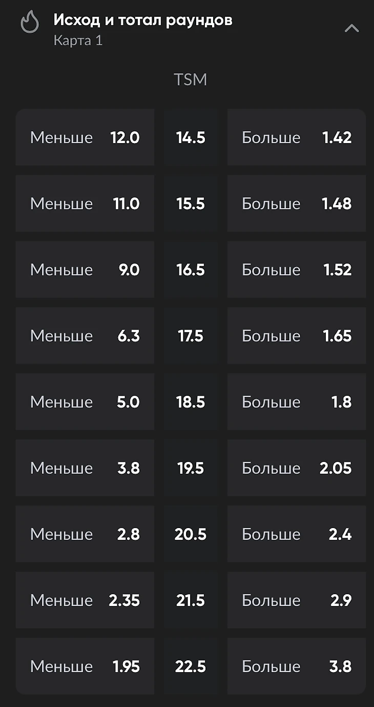 Ставка «Исход + тотал раундов» – это комбинированное пари, в котором игрок одновременно прогнозирует исход карты или матча и количество сыгранных раундов.
