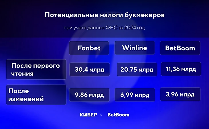 Похожая ситуация у Winline: оборот – 415 млрд, GGR – 99,9 млрд. Потенциальные налоги – 20,75 млрд против 6,99 млрд. У BetBoom: оборот – 227,2 млрд, GGR – 56,6 млрд. Разница также почти в три раза – 11,36 млрд и 3,96 млрд после изменений в законопроекте.