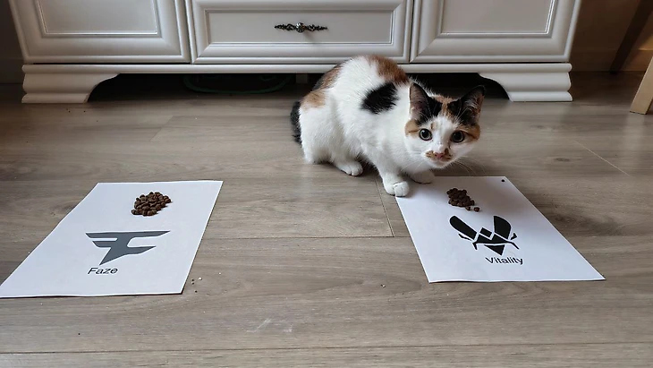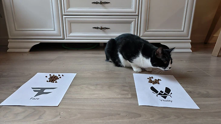 Кошка Изи обычно спит рядом со мной, когда я смотрю CS, так что наверняка в курсе всех перипетий турнира. Я посадил ее перед двумя листочками, и она без тени сомнений пошла к Vitality. Ждем уверенной победы?