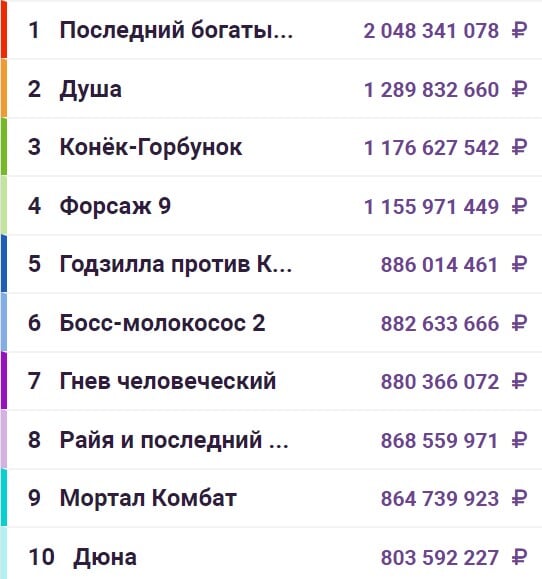 В тройку лидеров вошли «Последний богатырь: Корень зла» (2 млрд рублей), «Душа» (1,2 млрд рублей) и «Конек-Горбунок» (1,1 млрд рублей).