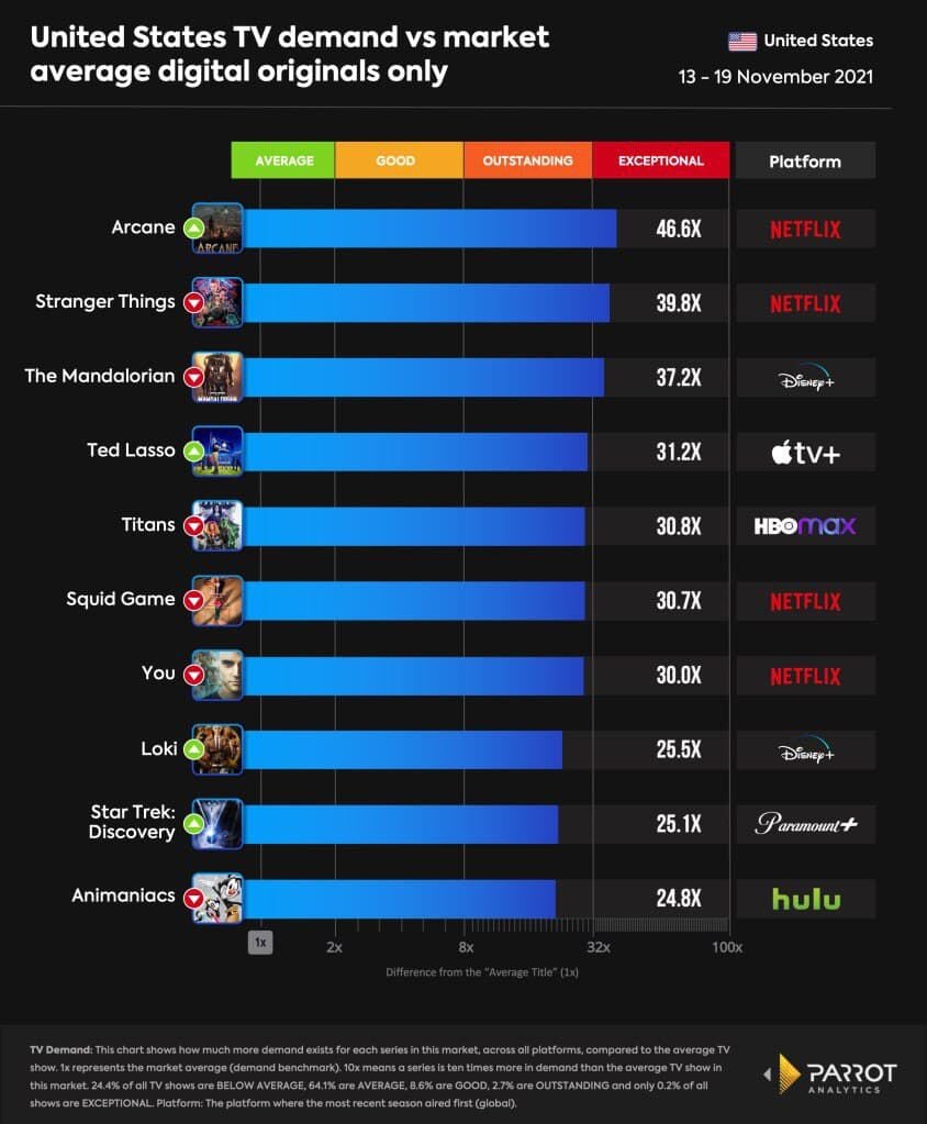 Согласно информации Parrot Analytics, зрительский спрос на каждый эпизод шоу от Riot Games и Netflix был в 46,6 раза выше обычных значений для телевизионных шоу. Arcane попал в 0,2% всех шоу, получив категорию «исключительное ТВ-шоу» – последнюю из 4-х категорий рейтинга.