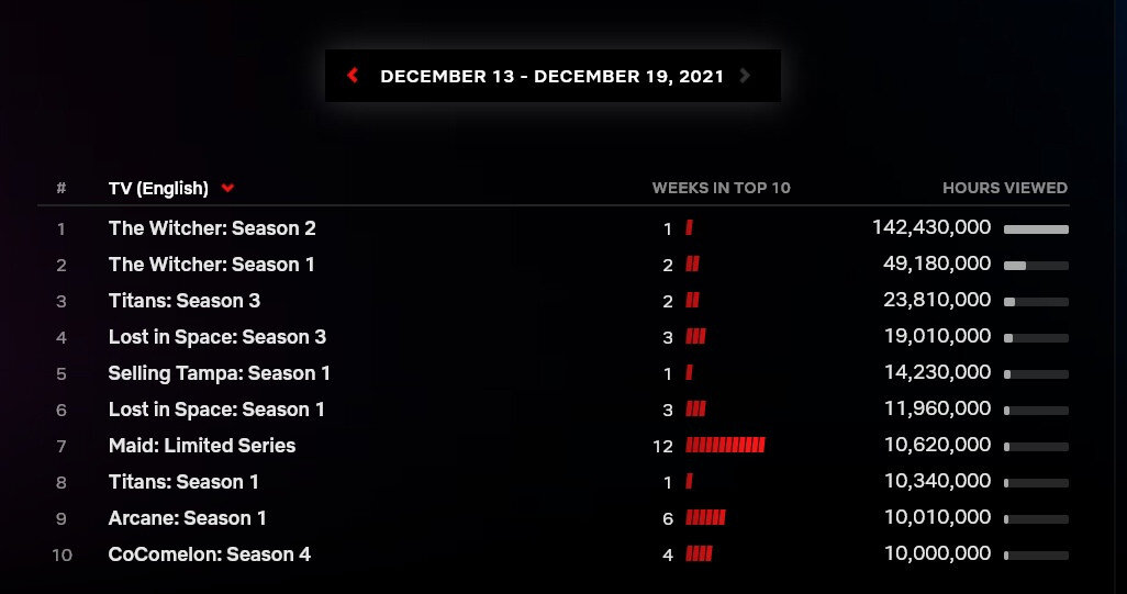 Сериал занял первое место среди англоязычных проектов. Стоит отметить, что первый сезон «Ведьмака» расположился на второй строчке рейтинга (49 млн часов).