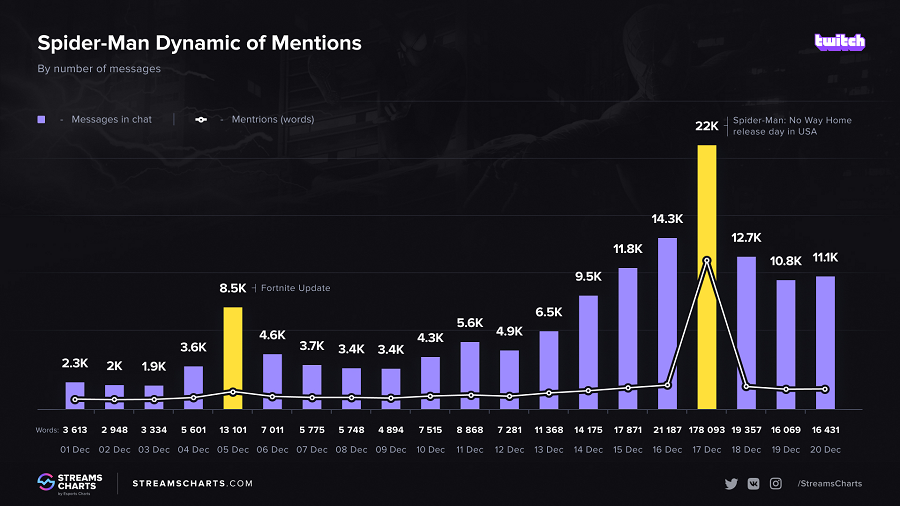 Streams Charts собрал статистику упоминаний Человека-паука в чатах на Twitch.