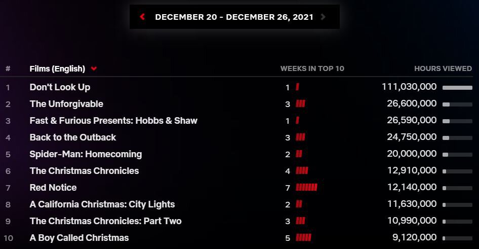 Среди фильмов лидирует комедия «Не смотрите наверх», набравшая 111 млн часов просмотров.
