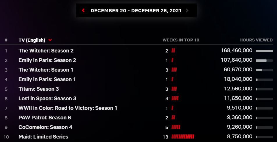 Среди сериалов лидерство сохранил второй сезон «Ведьмака» – 168 млн часов. Второй сезон сериала «Эмили в Париже» расположился на второй строчке – 107 млн часов. Первые сезоны «Ведьмака» и «Эмили в Париже» занимают третье и четвертое место соответственно.
