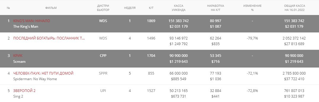 Возглавил российский кинопрокат по результатам уик-энда «King’s Man: Начало», топ-3 замкнул «Крик».