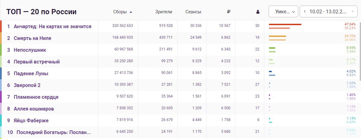 За первый уик-энд экранизация Uncharted заработала 320 млн рублей. В топ-3 также вошли детектив «Смерть на Ниле» (168 млн) и комедия «Непослушник» (60,9 млн).