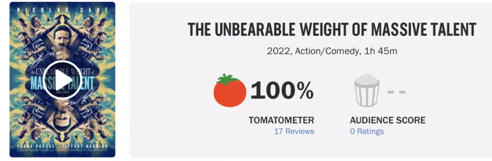 «Невыносимая тяжесть огромного таланта» с Николасом Кейджем в роли Николаса Кейджа получила 100% «свежести» на Rotten Tomatoes