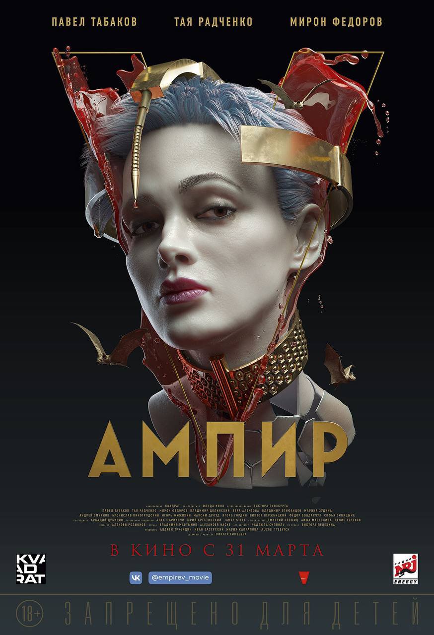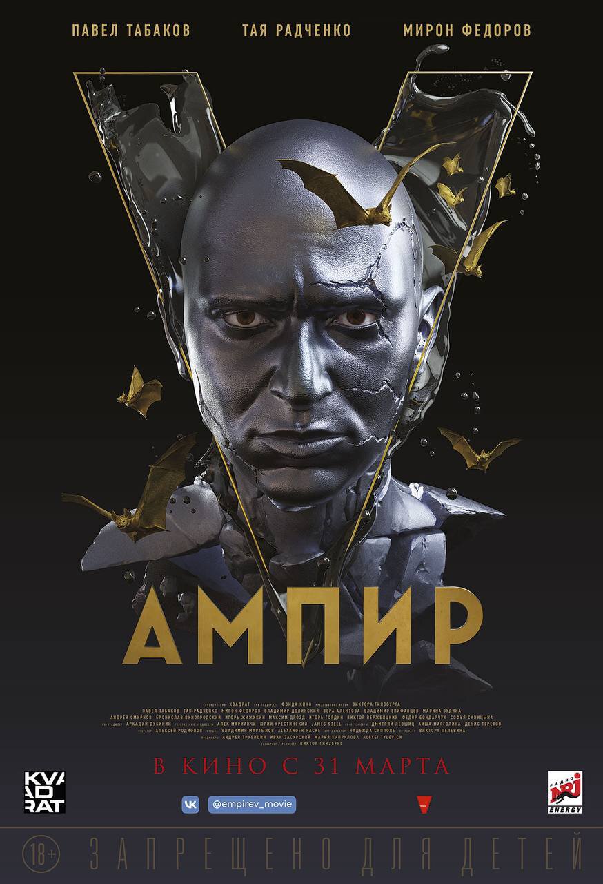«Ампир V» – фильм по роману «Empire V» Виктора Пелевина. Помимо Оксимирона, в нем снялись Павел Табаков («Дуэлянт», «Мятеж»), Марина Зудина («Содержанки»), Вера Алентова («Москва слезам не верит») и Тая Радченко.