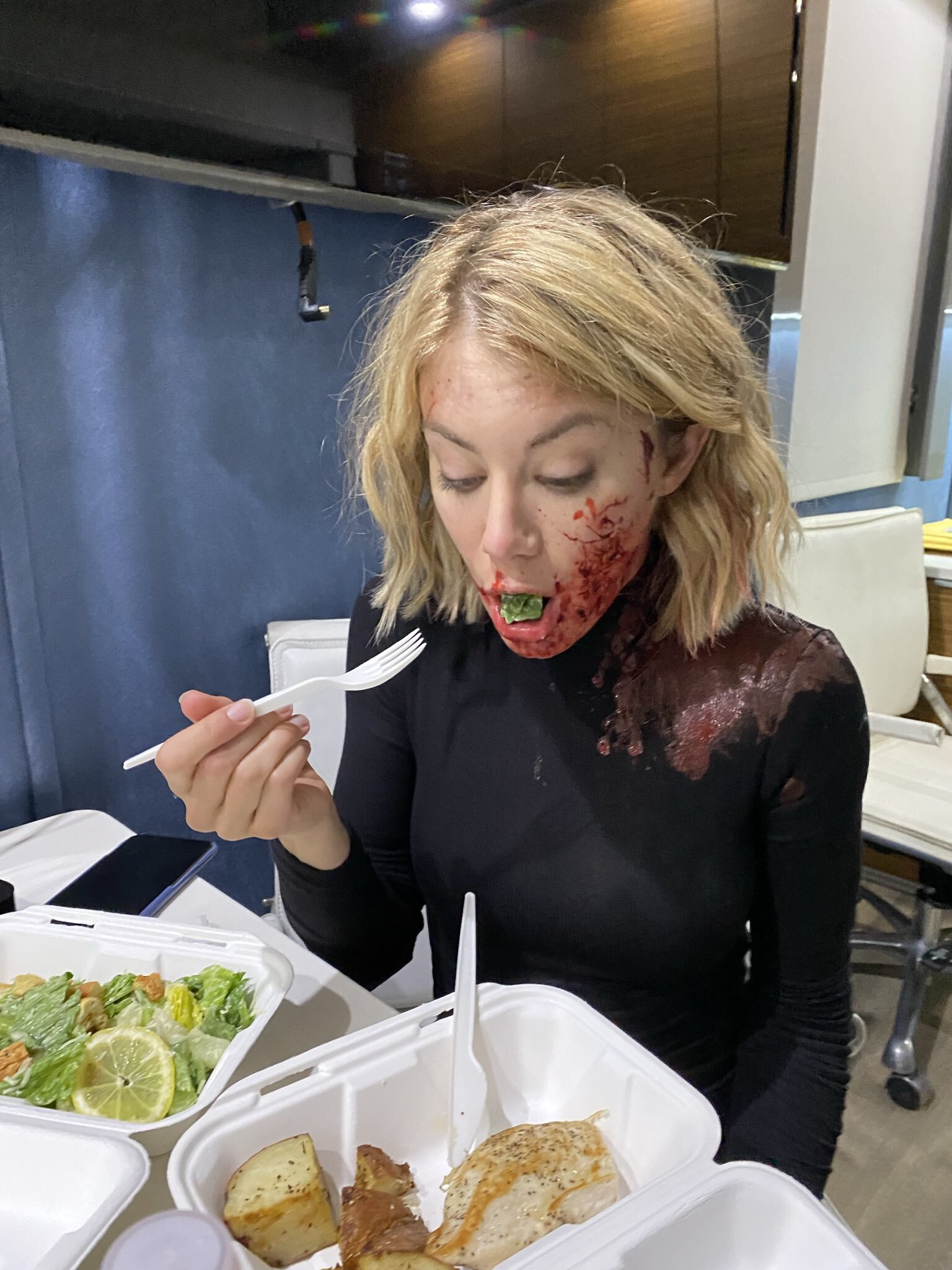 Также Ганн опубликовал фотографию, на которой Дженнифер Холланд [Эмилия Харкор] обедает на съемочной площадке.