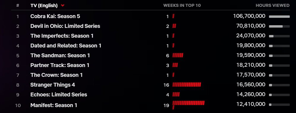 Резкий прирост просмотров случился после смерти королевы Великобритании. Сейчас сериал находится на 7-й строчке в рейтинге и имеет 17,57 млн часов просмотра.