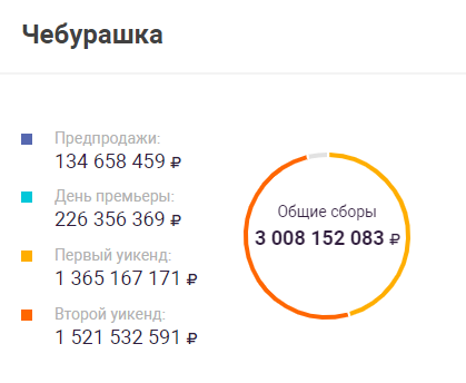 На данный момент кассовые сбора фильма составляют 3 008 152 083 рубля. Отметим, что до звания самой прибыльной кинокартиный в России «Чебурашке» нужно собрать чуть больше 500 млн рублей.