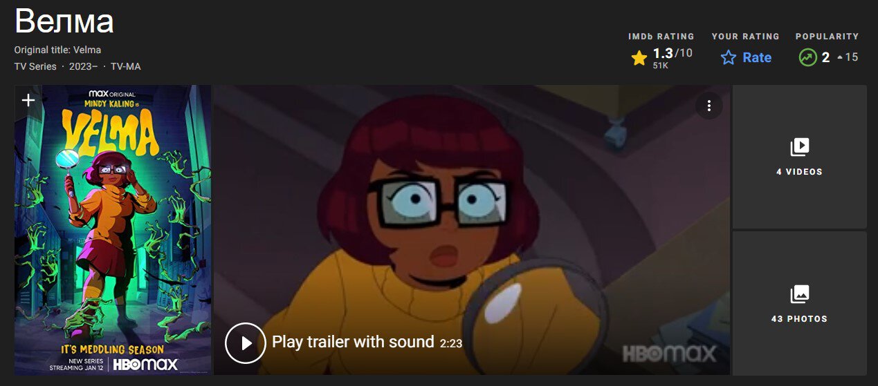 Мультсериал о темнокожей Велме из «Скуби-Ду» стал одним из худших в истории на IMDb – 1,3 балла