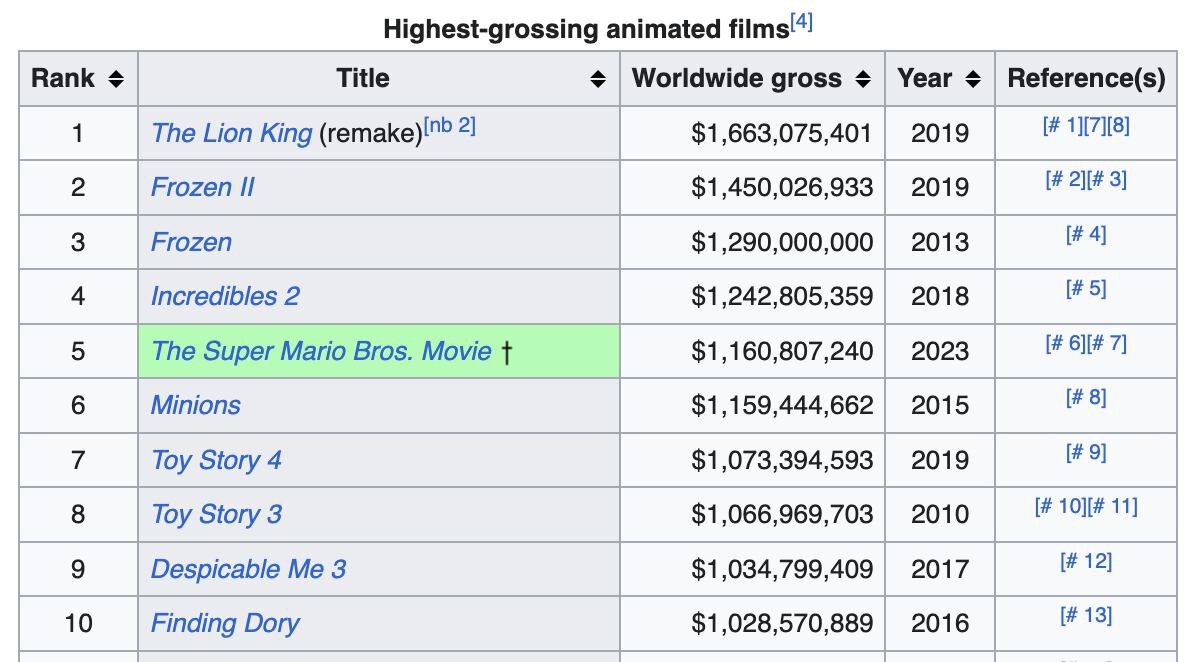Общие сборы в прокате «Марио» составляют порядка 1,175 млрд долларов. На первой строчке топа находится ремейк «Короля Льва» с 1,6 млрд долларов.