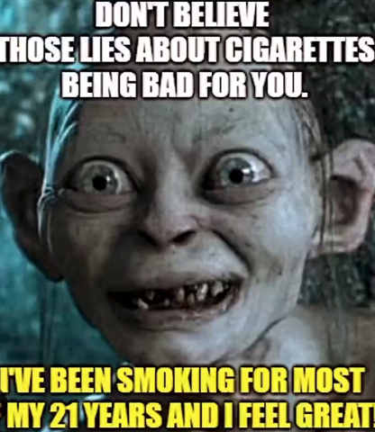 Наталья Ортега работает медсестрой. Сперва она запостила мем с Голлумом и фразой «Не верьте вранью о том, что сигареты вредны для вас. Я курю почти всю свою жизнь, мне 21 год, чувствую себя прекрасно!»