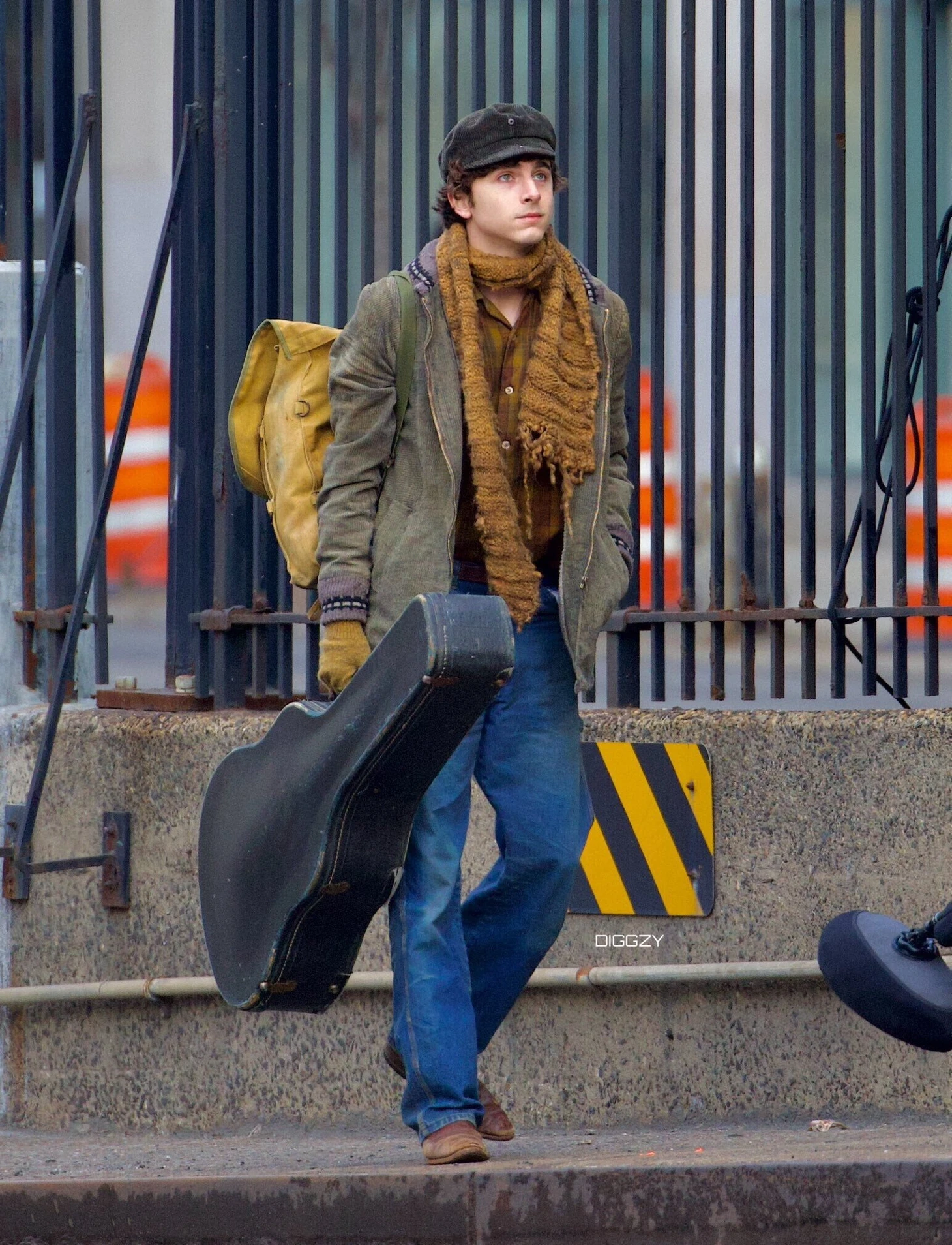Тимоти Шаламе на съемках байопика про Боба Дилана