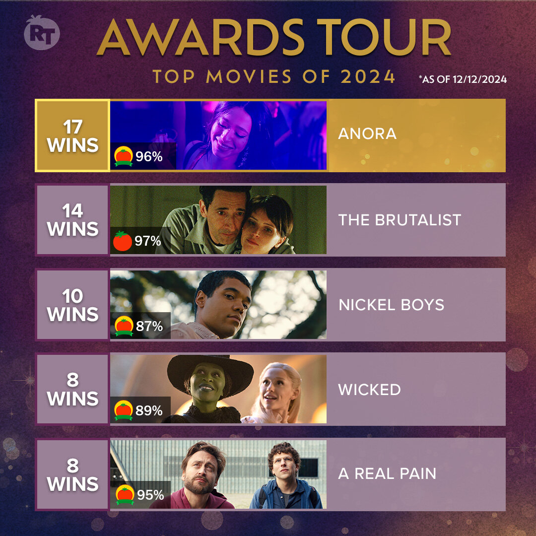 Сайт Rotten Tomatoes сообщил, что «Анора» получил 17 наград на различных премиях в 2024 году.