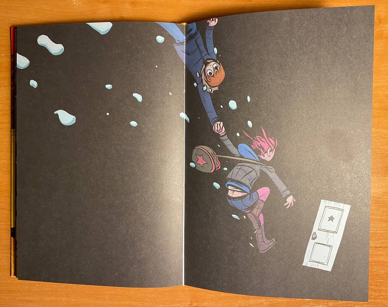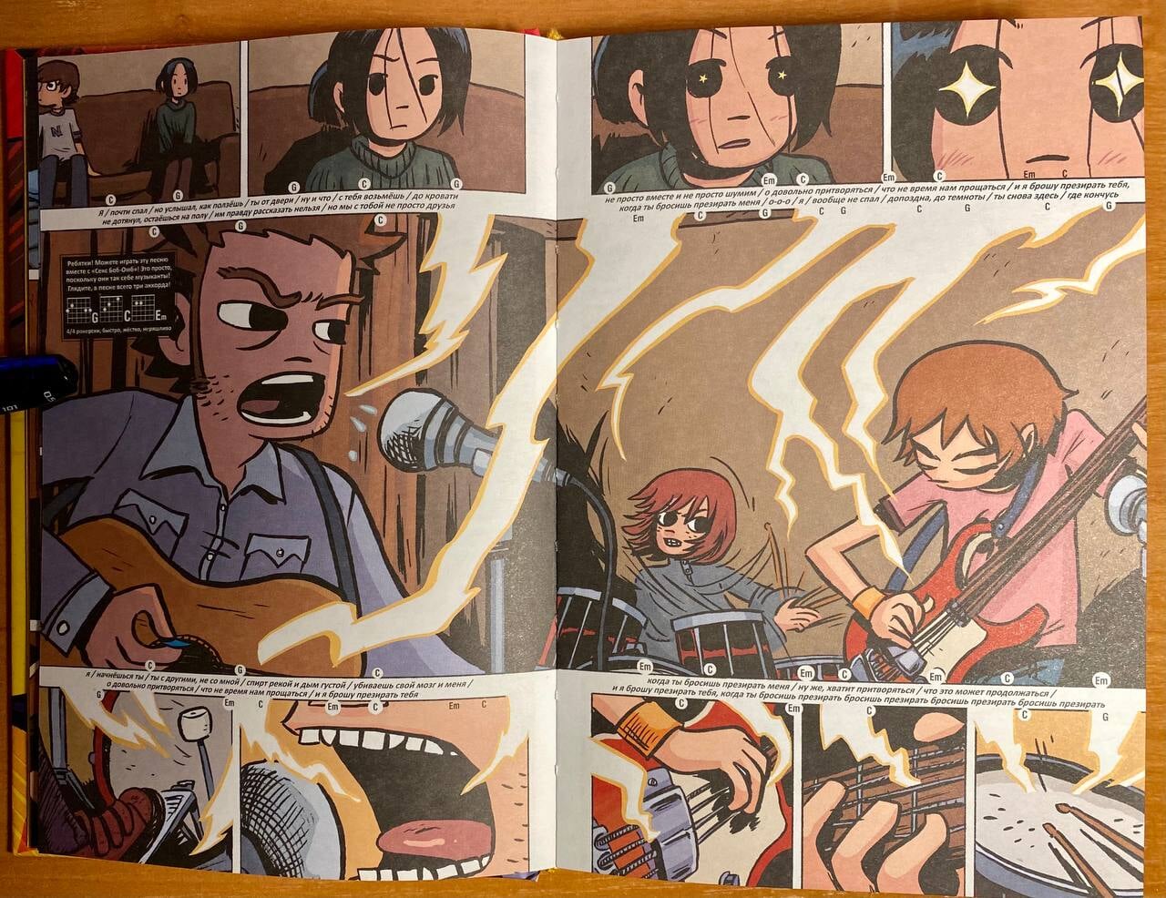 Разворот, на котором рок-группа Скотта впервые репетирует при Найвз, тоже непрост. Тут аж три параллельных сюжета (сверху, снизу и центральный фрейм), растянутые по всей ширине слова песни с подписанными аккордами и даже призыв автора разучить мелодию с расшифровкой упомянутых аккордов. Да, О’Мэлли не поленился сочинить песню, которую нельзя было услышать.