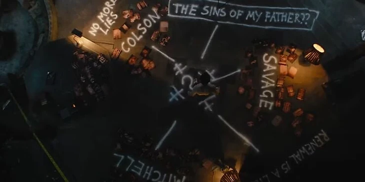 У Бэтмена есть репутация «величайшего детектива», но в предыдущих фильмах этой стороне персонажа уделяли очень мало внимания. Кажется, теперь все будет несколько иначе: в одной из сцен показан пол Бэт-пещеры, на котором Брюс разместил все собранные улики и попытался вычислить план Загадочника: в кадре упоминается погибший мэр Готэма и Гил Колсон, окружной прокурор – видимо, еще одна жертва злодея. Фраза «Хватит лжи» ранее была в офисе мэра.