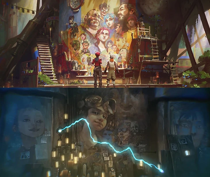 Мурал с погибшими уже был в трейлере Экко. Девочка в очках сварщика изображена на карте «Заунская оборванка» в «Рунетерре». Мурал изменился в сериале.