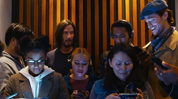 Итак, Нео прописаны синие пилюли. По первому фильму мы помним, что они заставляют людей думать о том, что Матрица не является реальностью. Данный прием режиссер продолжает использовать и в The Matrix Resurrections. А вот чего не было на момент съемок первого фильма трилогии, так это современных гаджетов и зависимости человека от них. Вспомните, какими были первые сотовые телефоны в 1999 году. Не было планшетов, смартфонов и прочих современных устройств. Обратите внимание на сцену в лифте. Глаза всех присутствующих, кроме Нео, устремлены в их портативные устройства. Очевидно, что это еще одна возможность для машин, позволяющая держать людей в неведении в их цифровой тюрьме.