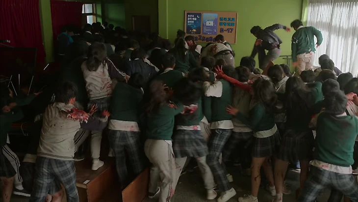 Учитель английского Пак Сунхва объявляет по голосовому вещанию о «чем-то странном» и просит учеников спрятаться. После бойни в столовой образовались группы: четверо учеников в туалете, несколько учеников прячутся в столовой (в том числе один из хулиганов Юн Гвинам), несколько учеников в библиотеке, двое на крыше и группа учеников в кабинете биологии.