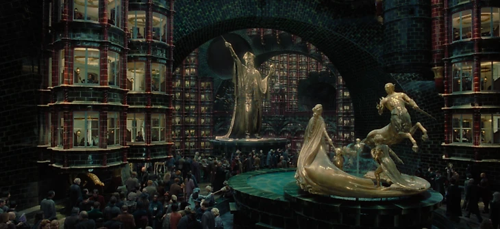 Атриум Министерства магии – самая масштабная декорация среди всех созданных для фильмов серии. Строили ее три месяца, длина декорации – 60 метров, стены и арки выложены плиткой темно-зеленого и красных оттенков, как на некоторых станциях лондонского метро начала XX века.