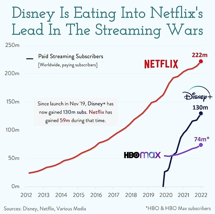 У Disney+ же все отлично. Компании понадобилось 2 года и месяц, чтобы с нуля достичь 130 млн платных подписчиков. К примеру, нынешнему лидеру индустрии Netflix на это понадобилось 11 лет и 8 месяцев. Впрочем, Нетфликс зародил бизнес потокового вещания и долгое время был единственным сервисом подобного рода. Сейчас времена большой конкуренции и передела рынка: Disney+ выглядит важнейшим игроком и главной альтернативой Netflix. HBO Max развивается не так стремительно: у сервиса много подписчиков канала HBO, а вот новые пользователи приходят крайне медленно. Сейчас на HBO Max подписаны 74 миллиона людей.