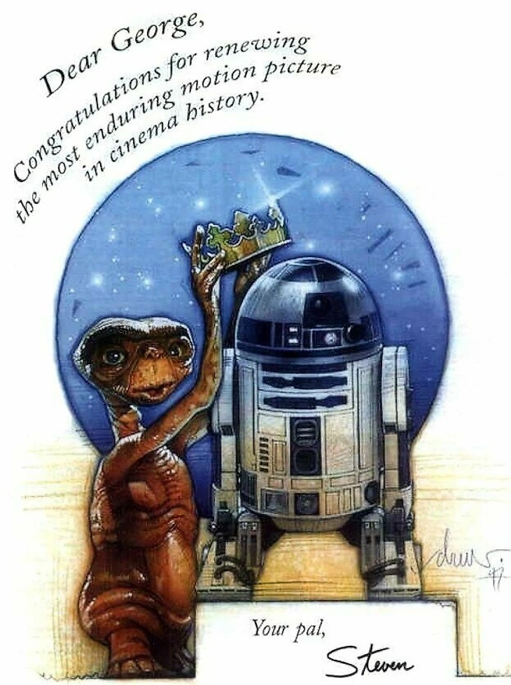 Спустя несколько лет самым кассовым фильмом в США стал «Инопланетянин» Спилберга, и Лукас любезно поздравил друга тем же способом. Теперь на открытке персонажи «Звездных войн» танцевали на вечеринке в честь нового рекордсмена, а Скайуокер с Ханом Соло подбрасывали инопланетянина в воздух.