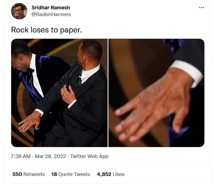 Уиллу Смиту шутка не понравилось, он вышел на сцену и сильно ударил Рока ладонью по лицу – тот аж покачнулся. А потом Смит прокричал комику в ухо: «Не упоминай имя моей жены своим чертовым ртом!».