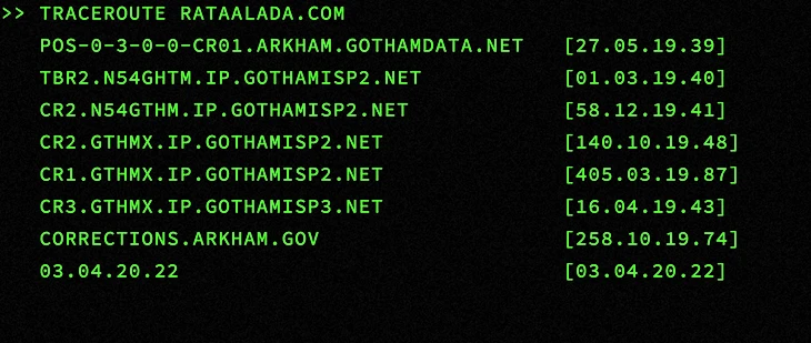 На экране начинает ярко-зеленым цветом мелькать надпись «Good Bye?». После мы видим смесь изображений похожих на шифр Загадочника, и всплывает какой-то текст, который можно рассмотреть только на стоп-кадре. На самом деле это ссылка на сайт Загадочника «Рата Алада». Он существует, но претерпел множество изменений с момента выхода Batman в прокат.