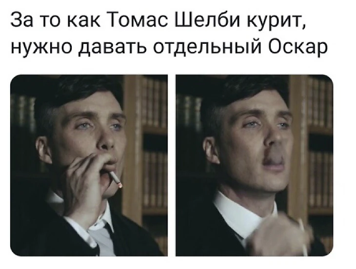 Часть мемов посвящена тому, как же эстетично актер Килиан Мерфи, исполнивший роль Томаса, курит сигарету. На всякий случай – мы этого не одобряем.