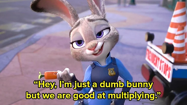 В одной из сцен Джуди, подсчитывая, сколько денег Ник задолжал звериному законодательству за годы укрывательства налогов, вскользь замечает: «I mean, I’m just a dumb bunny, but we are good at multiplying» («Может, я и тупая крольчиха, но умножаем мы неплохо»). В переводе смысл потерялся, но в оригинале multiplying имеет два значения – «умножать» и «размножаться».