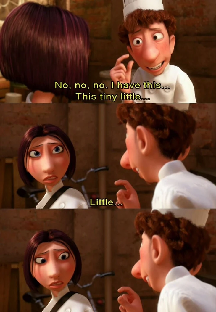 При всей милоте «Рататуй» все-таки о Франции, а где французы – там и чувственные моменты. Так, где-то в середине повествования Лингвини чуть не выдает Колетт их с Реми общий секрет раньше времени. К счастью, оратор из него ужасный; к тому же само положение дел настолько безумное, что Лингвини не знает, как подступиться к сложному разговору. И выбирает самый ужасный вариант: