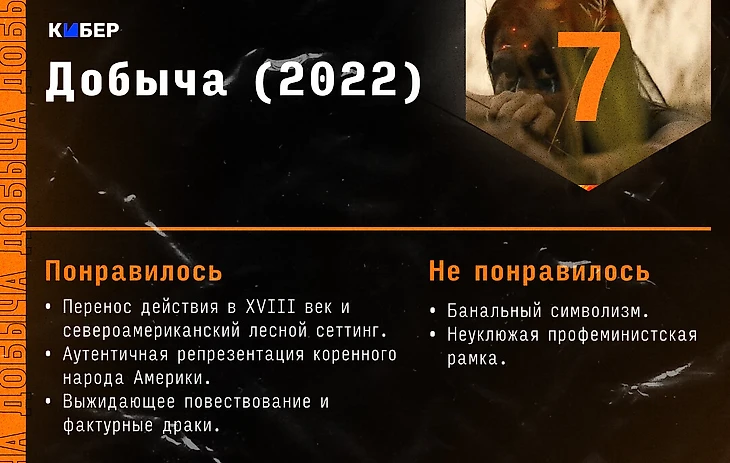 У «Добычи» самый изобретательный визуал из всех «Хищников». Камера оператора Джеффа Каттера неспешно скользит по туманным североамериканским лесам, фиксируя крадущихся охотников команчи. И в этом главное отличие «Добычи» от предыдущих фильмов: Трахтенберг слезает с иглы непрерывного экшена и замедляет визуальное повествование. Режиссер разбавляет смертоносные удары Хищника медитативными планами чистой природы.