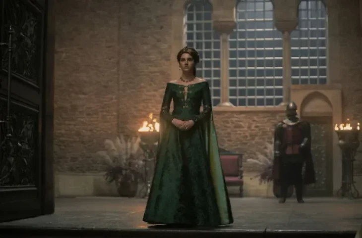 Празднование королевской свадьбы. Визерис толкает торжественную речь, но появляется Алисента в зеленом платье и всех затмевает. Декодинг наряда производит новый герой – Ларис Стронг – плут и покалеченный сын нового десницы. Зеленый цвет символизирует политическую самостоятельность и силу Хайтауэров. Очевидно, королева выбрала сторону в грядущей гражданской войне.
