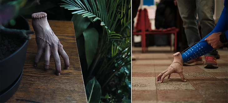 Тим Бертон хотел, чтобы съемки проходили так же, как в старых фильмах. Поэтому обрубок не совсем бестелесный – им управляет Виктор Доробанту, фокусник и иллюзионист. Актер жестикулировал правой рукой, ползал по полу, катался на тележке, а на постпродакшене убирали все лишнее.