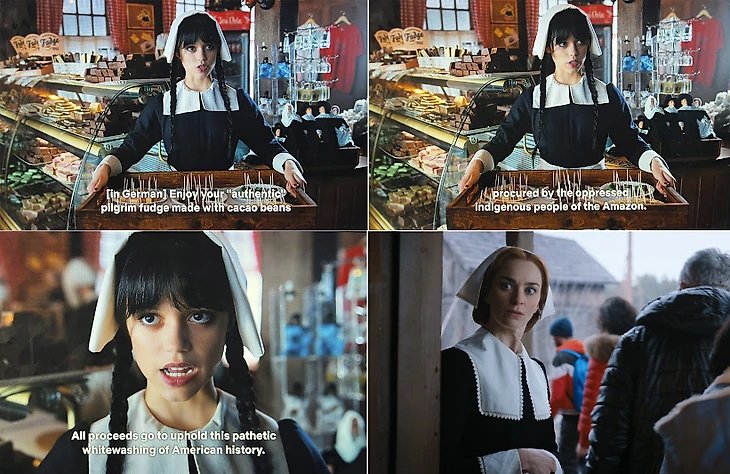«[Говорит на немецком] Отведайте аутентичный ирис пилигримов из какао-бобов, собранных угнетенными коренными народами Амазонии. Все вырученные средства идут на обеление истории Америки. А еще.. молочный ирис изобрели только через 258 лет»